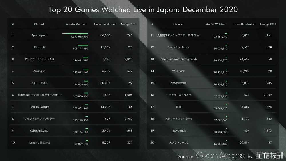 個人的には大穴でPUBGの復興を期待している。ベースの視聴時間が多い点とカスタムマッチが比較的開きやすい点を考慮すると意外とあるかもしれない。