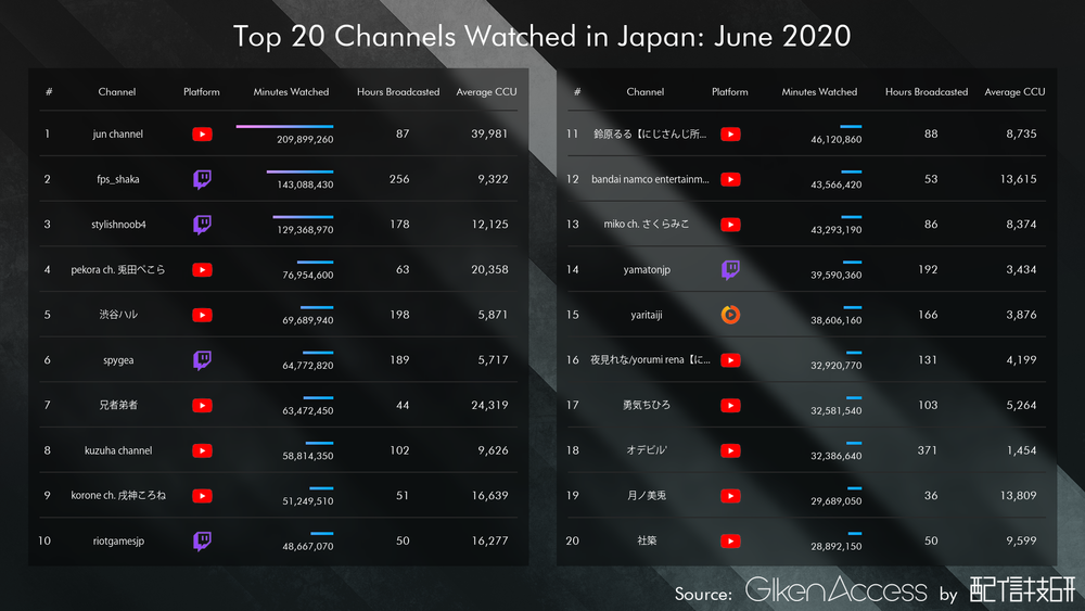 6月のトップ20の平均配信時間は驚異の124.7時間。これは単純計算で一か月間毎日4時間以上配信していることになる。つまり、上位配信者になるには、質もさることながら、「配信時間」や「配信頻度」も高水準に保つ必要もあるようだ。