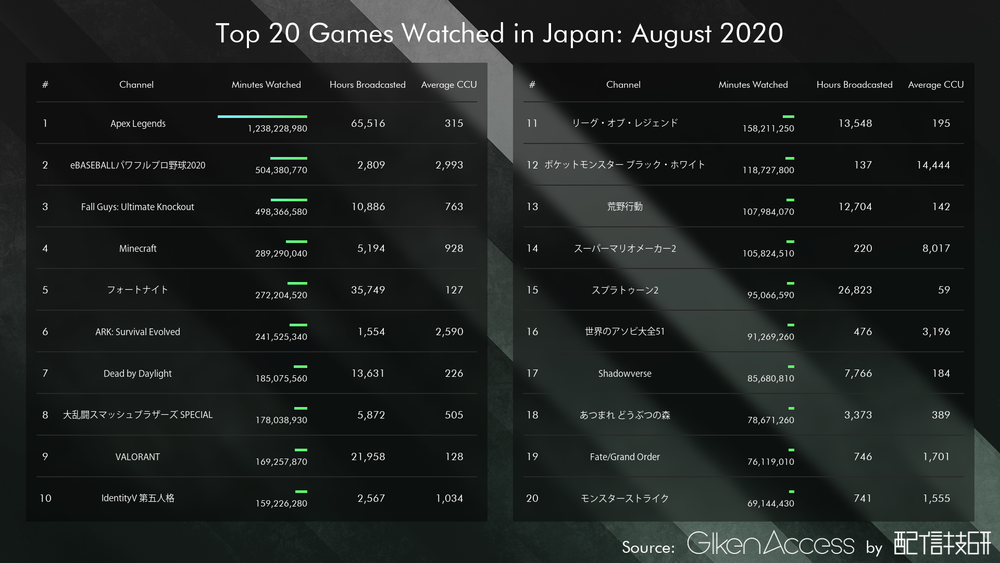 Apex Legends以外のタイトルは、Q2と比べて徐々に順位を落としている。20位以内のタイトルは軒並みランクダウンしている。しかし、これは日本だけの傾向ではなく世界的な傾向である。世界でもLeague of LegendsやFortnite以外がランクを落としている。