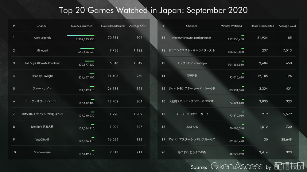 日本では「Minecraft」「Fall Guys」「Dead by Daylight」が、世界では「Among Us」「Fallguys」「Minecraft」「GTA 5」が上昇している。